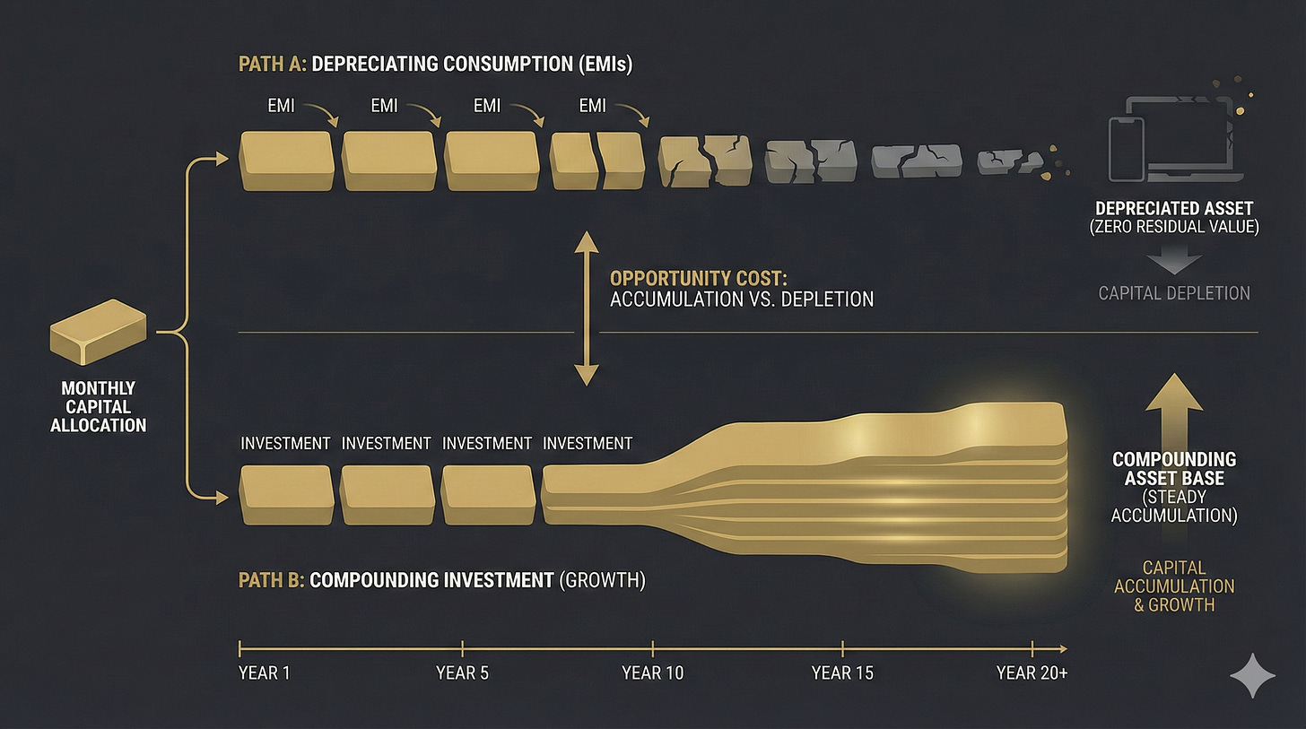 And every month you choose consumption over compounding, that choice echoes far longer than the EMI tenure itself.